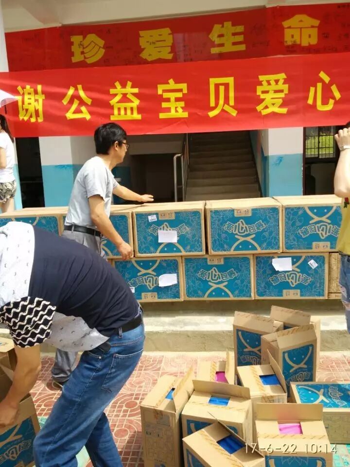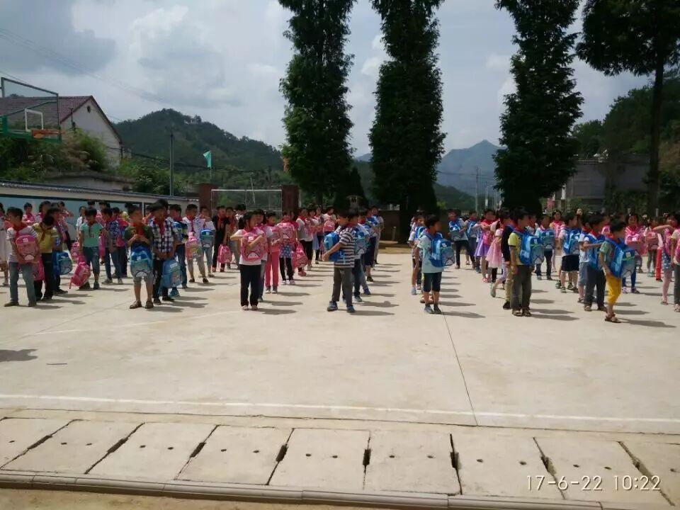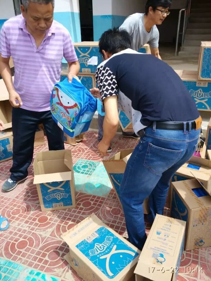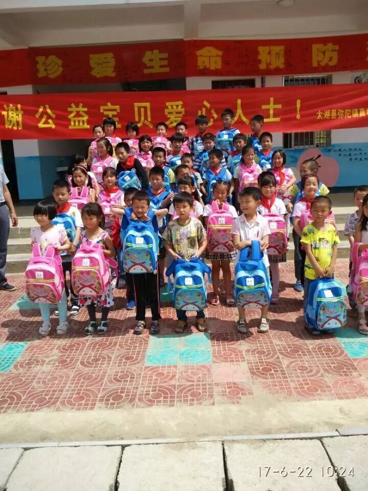 6月22日,“公益宝贝爱心人士”为 弥陀镇真君小学学生赠送爱心书包,书包里有文典套装,绘画用品,水杯等。
