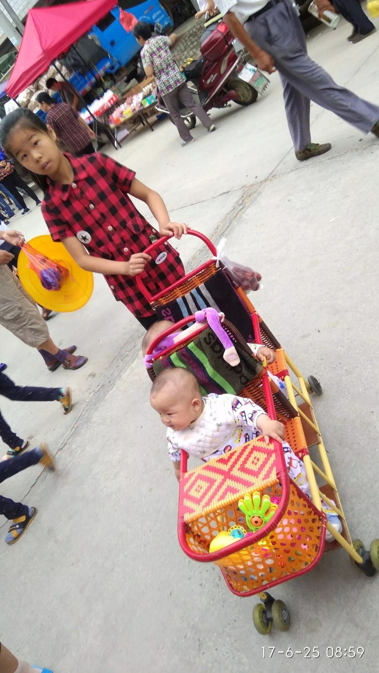 一个小姐姐推着一对双胞胎,吸引了大妈的关注